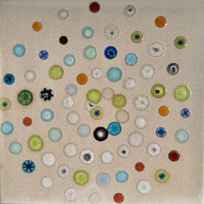 A love of ceramics, traditional millefiori and watercolor led to the creation of different, colourful, 30 x 30 cm ceramic pictures 15 years ago. Everything flows, the brittle glass flows over the ceramic plate like watercolor paint. The plates are fired together with the millefiori in the kiln, glazed and then fired again. The skill here is to maintain exactly the right temperature, the millefiori should flow but not melt.