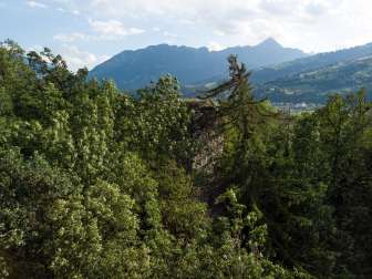 Ruins of a once extensive castle complex on a rocky hill below Präz.