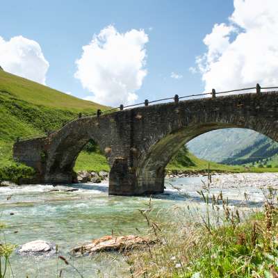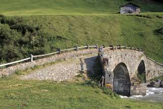 The Alte Landbrugg is located in the municipality of Hinterrhein in the Rheinwald and is an imposing stone bridge dating from 1693. It was built by master builder Peter Zurr from Bergün and spans the Hinterrhein with two arches over a length of almost 40 meters and a width of 2.5 meters. It originally served as a river crossing for the old mule track over the San Bernardino Pass.