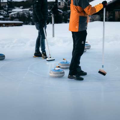 The Splügen Curling Club prepares two curling lanes, which can be hired as a group, when the temperatures are right.