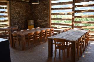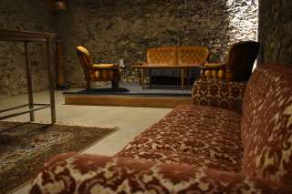 Surrounded by old walls and equally old beams and fitted with a transparent windbreak, a cozy atmosphere has been created. The large table in the center invites you to linger, as does the cozy seating area with sofa and armchairs. But before you get to sit down here, the eye catches sight of all sorts of things that are just waiting to be seen up close. Whether it's the old radio, the special light sources or the products for consumption presented on an old wooden stove and spreading a further touch of Italianità.