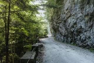 The hike begins in Thusis and leads past the north portal of the safety tunnel of the Crapteigtunnel. There, the repaired Grisons fence with stone steles gives an idea that a special structure begins here. The hike continues gently uphill past the former path maker's building (built before 1890). We explain the fountain and memorial stone we pass and reach the spot in front of the Känzeli, which was renovated in 2020-2023. The Känzeli with its view into the depths and to Hohen Rätien shows us that the engineers wanted to build a road that would be beautiful and scenic and connect Germany and Italy by almost the shortest route, not only for goods transports but also for travelers. After Känzeli, we pass through a short tunnel - a sensation at the time. After the tunnel, the road cuts through the rock along the high vertical wall of the gorge, which still gives you the shivers today, to Rongellen.