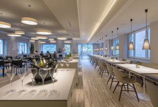 The 1848 restaurant commemorates the year the family hotel was founded. Here, guests who enjoy the breakfast buffet in the light-flooded, spacious room experience the modern and sophisticated ambience of the Hotel Weiss Kreuz. The Friends Table, an inviting tavolata with seating for 12, is particularly popular with groups. The stylish, simple interior creates an atmosphere of peace and relaxation.