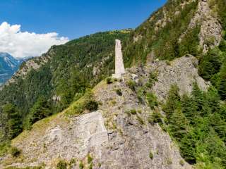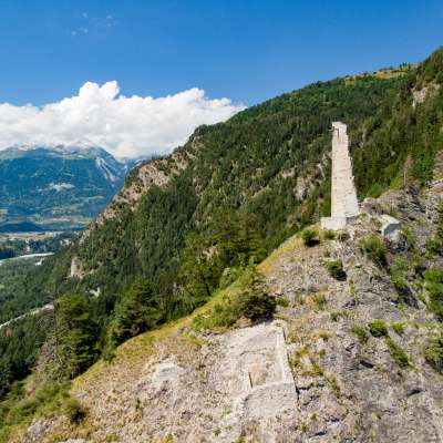 Hochjuvalt Castle was the seat of a lordship to which Scheid and Feldis also belonged. Its importance lay in the fact that the Vogelsang was able to block the road from Chur as it entered the Domleschg. It was destroyed in the Schamserfehde, but rebuilt afterwards. In 1462, Hoch-Juvalta was sold by Barbara von Juvalta to Junker Pedrut von Wannis and abandoned at the beginning of the 16th century. The complex consists of two parts, the actual castle on the rocky outcrop and the buildings on the road, where we can see the Juvalta farm. All that remains of the castle is a tooth of the wall of the four-storey residential tower and small remains of an extension and the ring. The "courtyard" was surrounded by a closed, subsequently extended ring of walls that let the road through in two gates. Parts of this wall and a corner building are still standing.